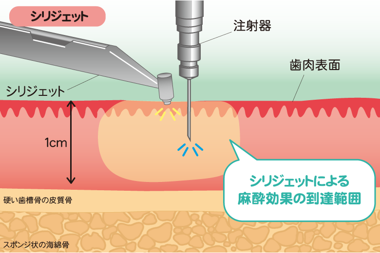 針をさすときのチクッを感じさせなくすることが目的なので、あらかじめごく少量の(0,025ml)麻酔液をジェット噴射することで歯茎に麻酔を浸透させるので、針がわからなかったと患者様によく言われます。痛みや針が苦手な方は是非体験してみてくださいね。